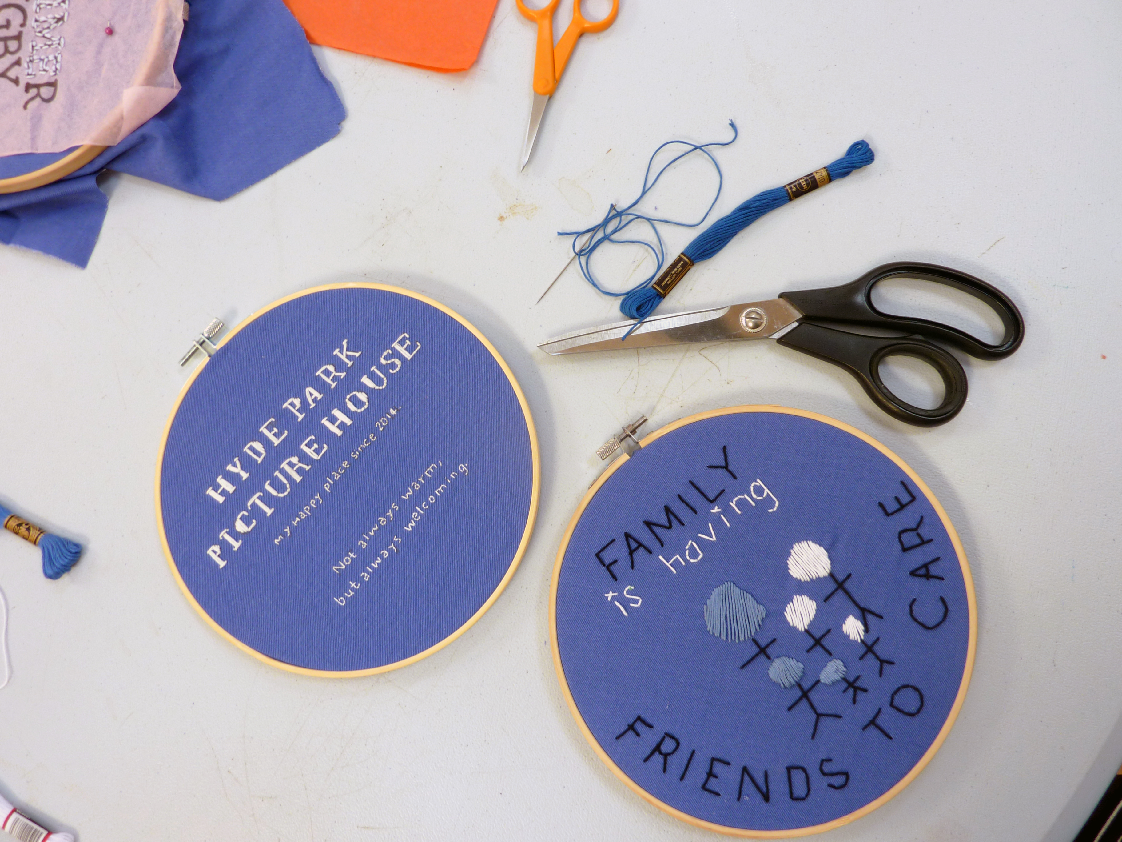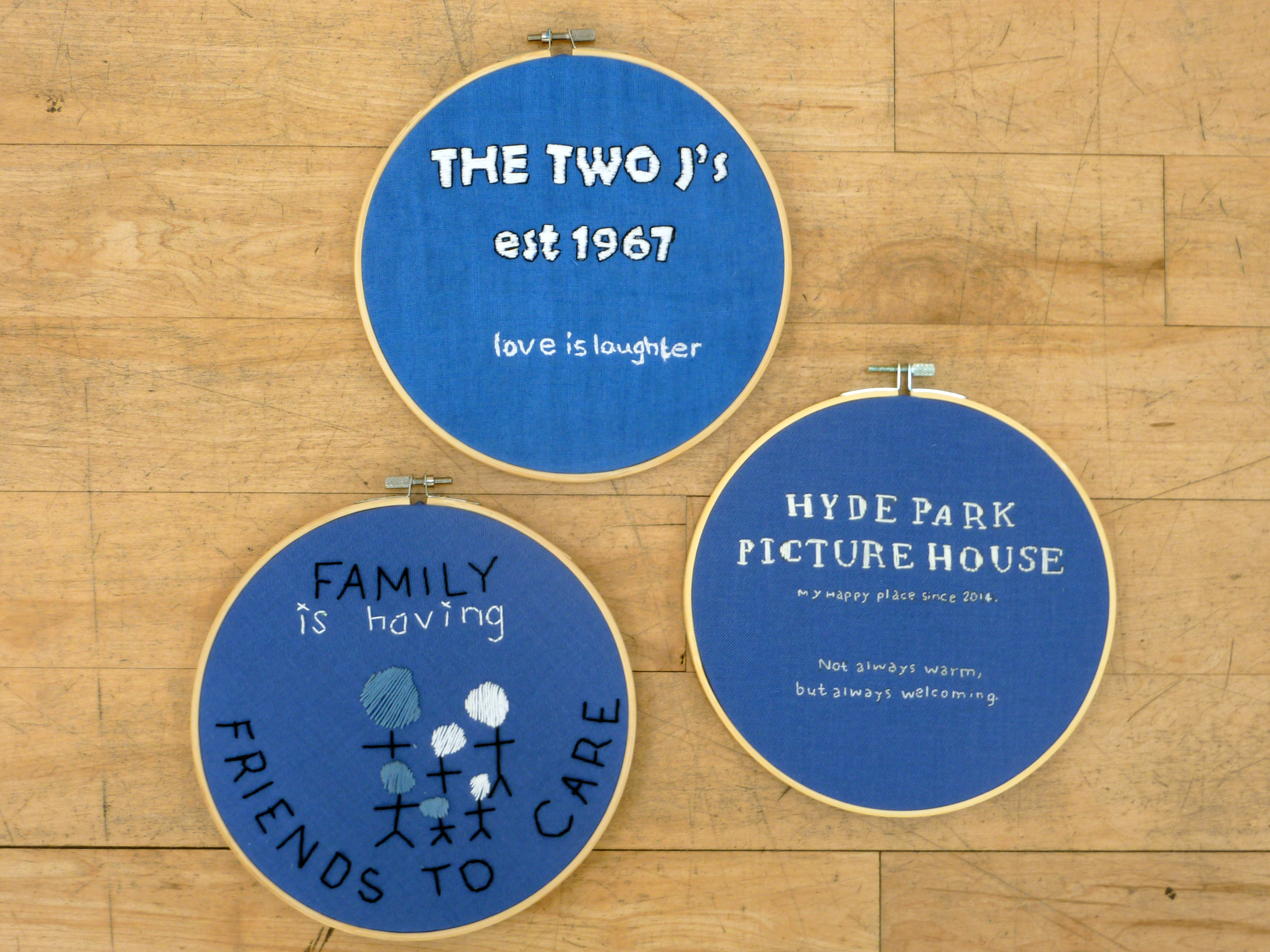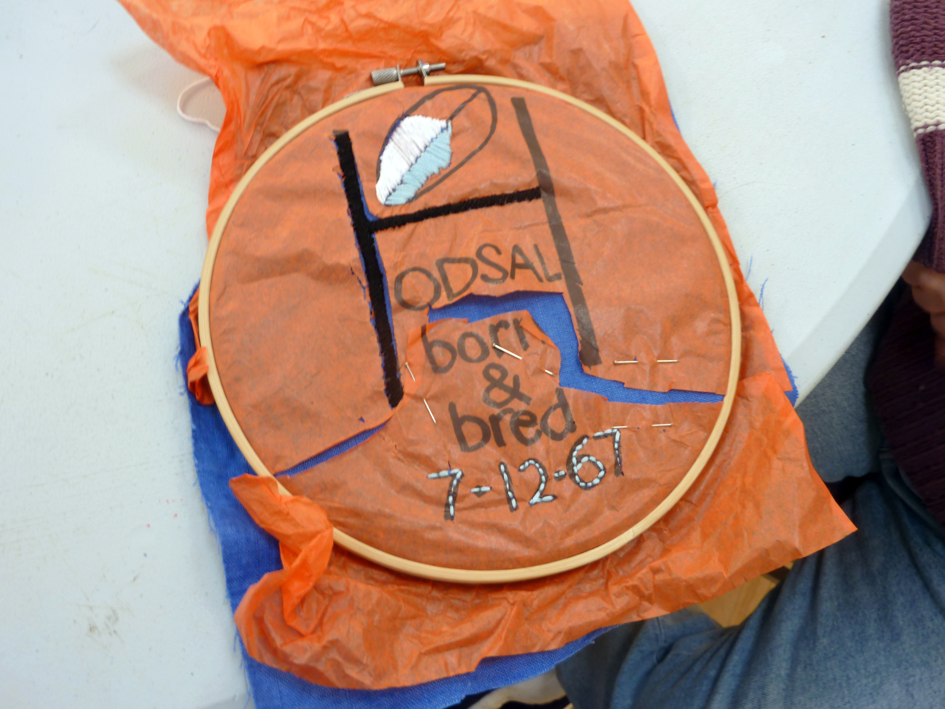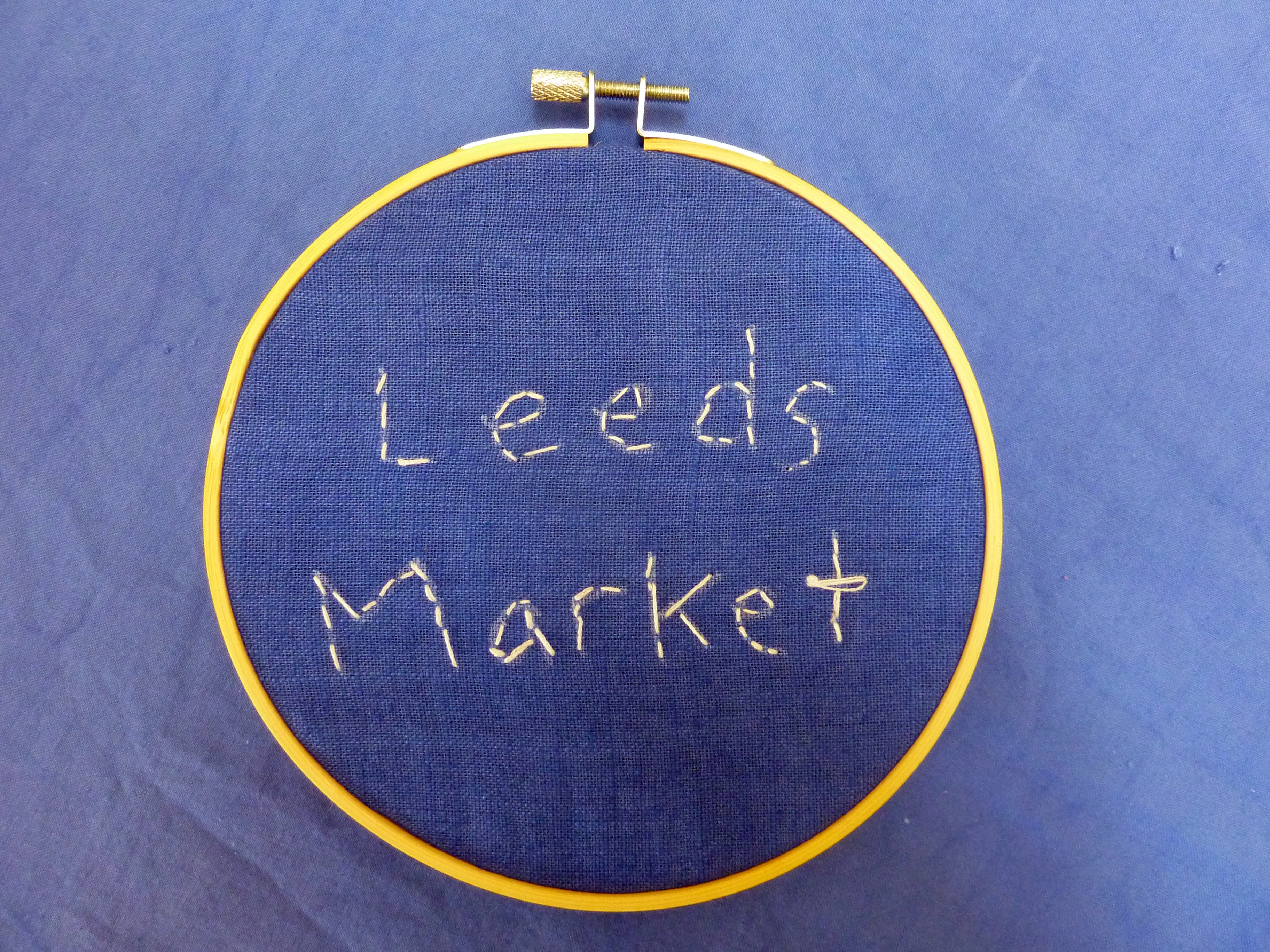 It feels almost as if Blue Plaques of Intangible Experiences is evolving into a club at Great Horton Village Hall – and maybe this is its future potential. We had two groups of ladies sitting at two tables. They are the same group that came the week before and I believe the two weeks before that. Their blue plaques are developing slowly, patiently and methodically over this time, their use of steady line, slight insertion of graphic imagery in places, and filling stitches to create bolder type are looking diverse and accomplished, unified by the blue fabric and restriction of the embroidery hoop as frame. I can’t help to compare and see how my stitch looks very wobbly and uncertain in comparison. Heads down, sewing, gentle chatter, people seem to be at ease.