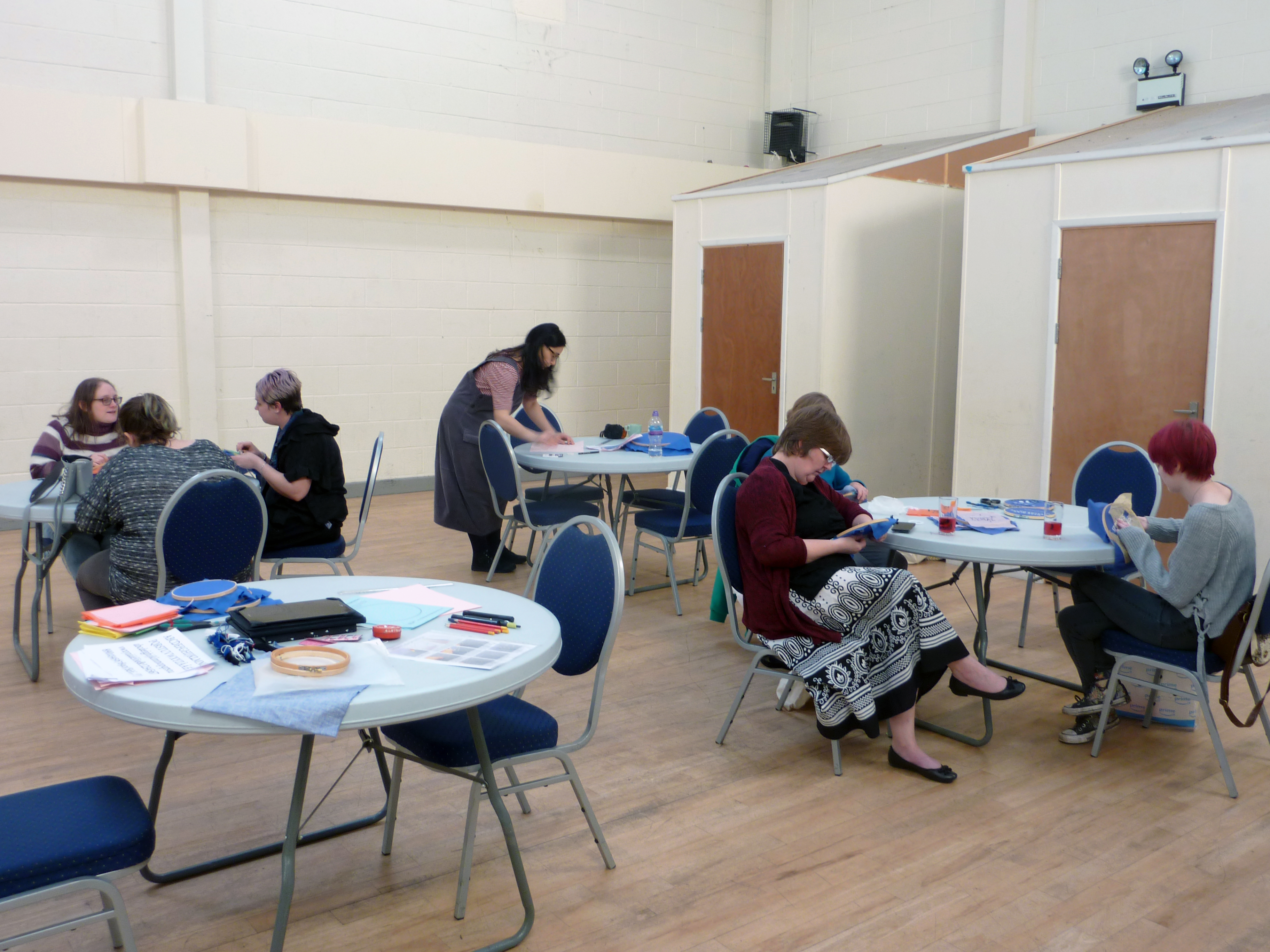 These three always sit together. I had not realized that it was child, mother and grandmother around one table! Just through the open doorway, is a glimpse of the ESOL session taking place in the small room. Notice behind the table, electric kettle, tea, coffee and biscuits set-up for us, which is a brilliant touch to any workshop.