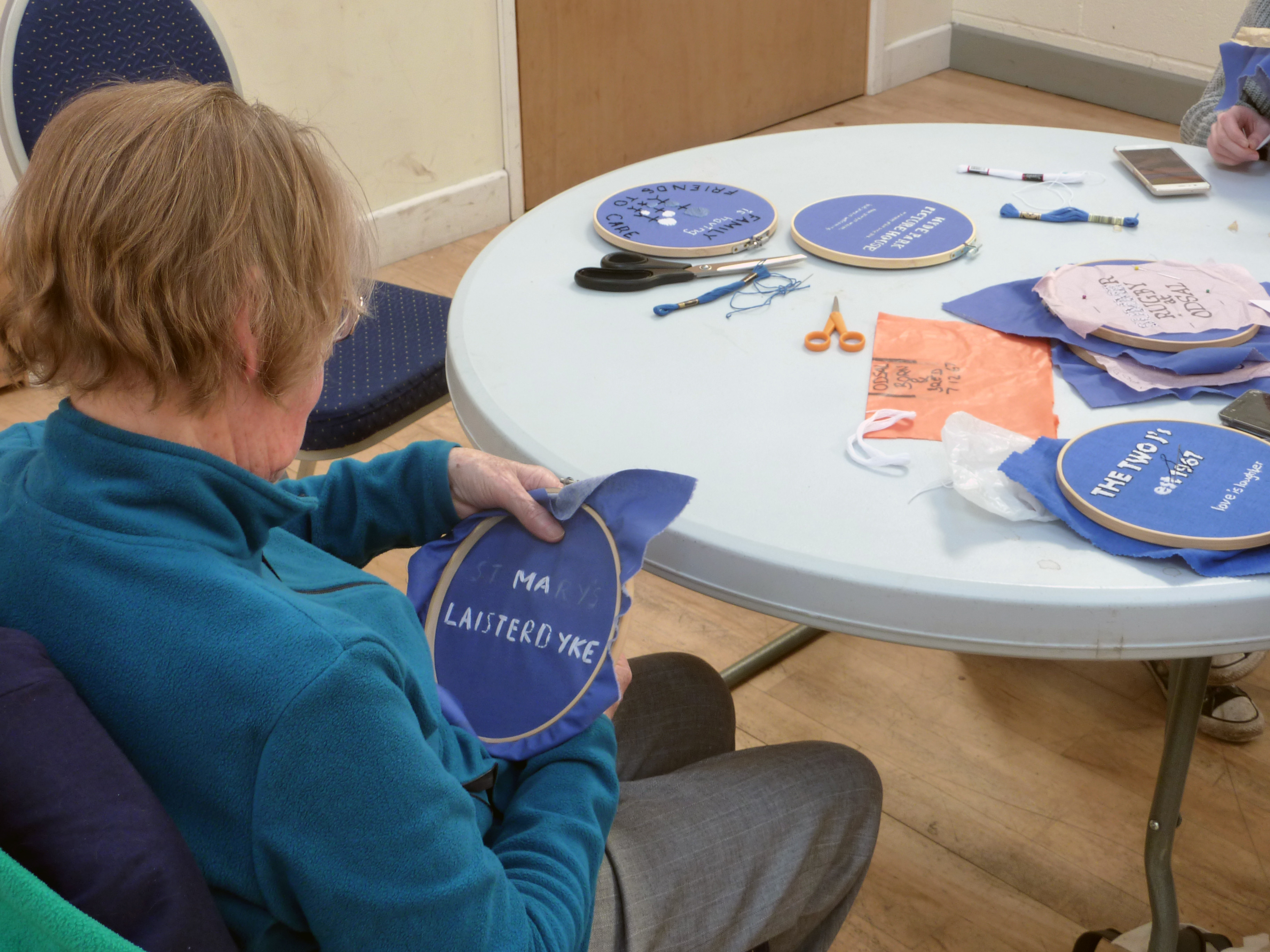 In the room next door the ESOL group had arrived. This is a group of people for whom English is their second language. Leigh and I went over to introduce ourselves and then mid-through our session, during their break, they came over to peek through the door. Leigh was welcoming and did a terrific presentation – communicating so clearly for those who have little English – bringing out physical examples of our stitch based work to show. Standing in the space, with others busying away on their Blue Plaques, hopefully gave the ESOL members a good sense of the project and felt at ease. To make this connection is really exciting and may open up Blue Plaques to more people, and possibly, through the very edited text that is achievable in stitched-based work, may become an accessible and hopefully interesting way to build confidence in basic English language skills. On talking with the instructor, it became evident that we could further this, possibly taking the project to other similar ESOL groups beyond Great Horton Village Hall.
