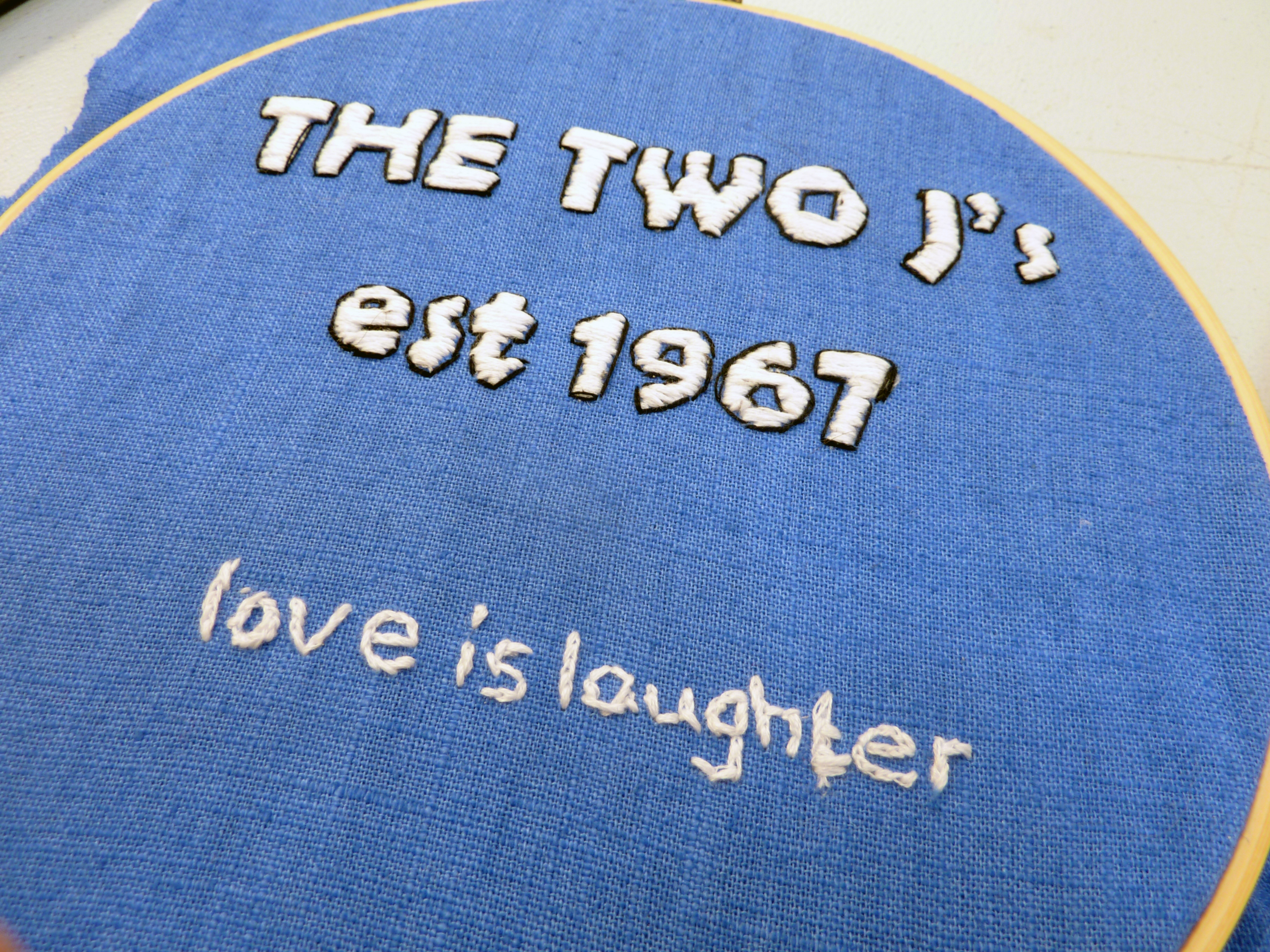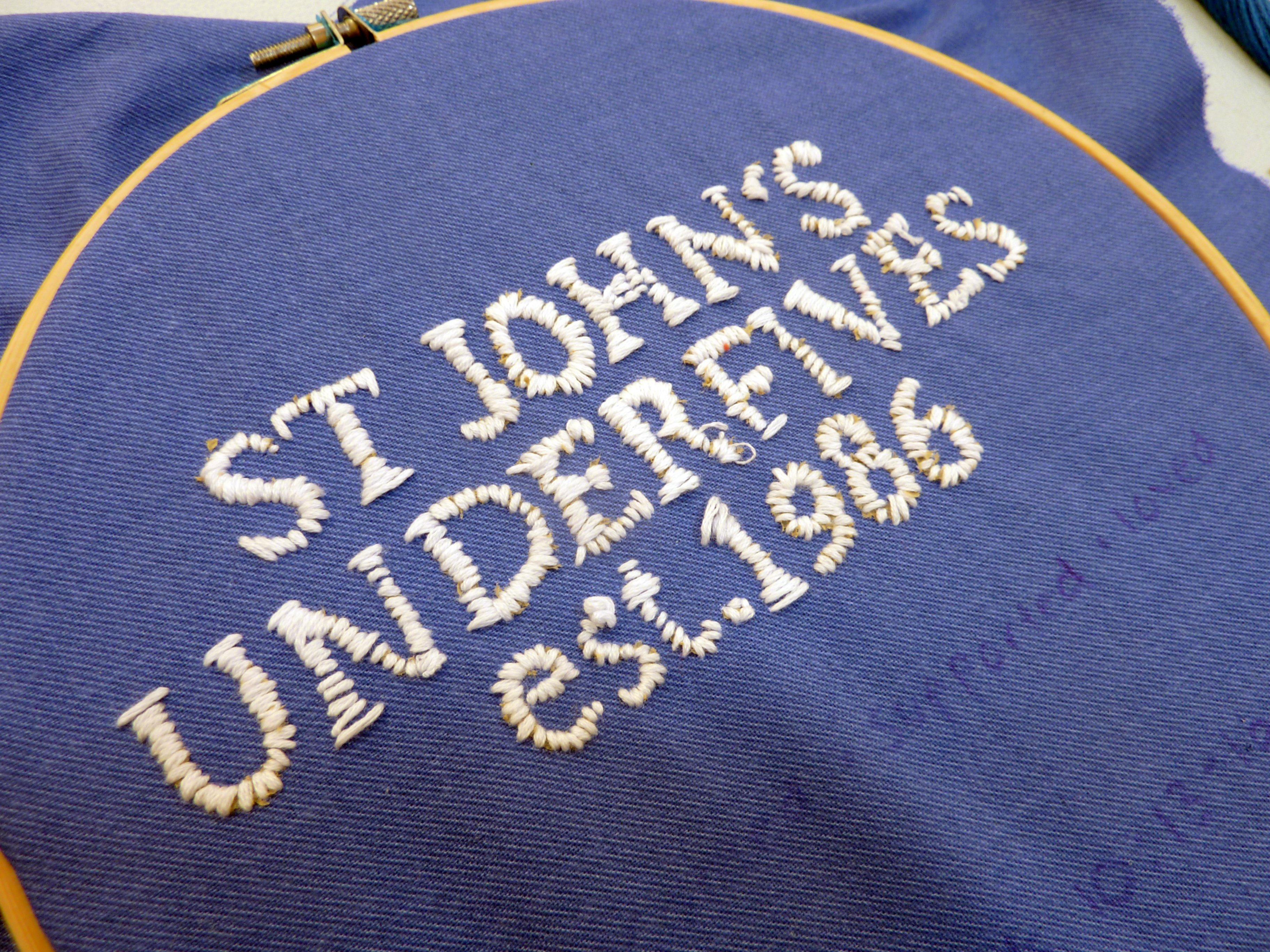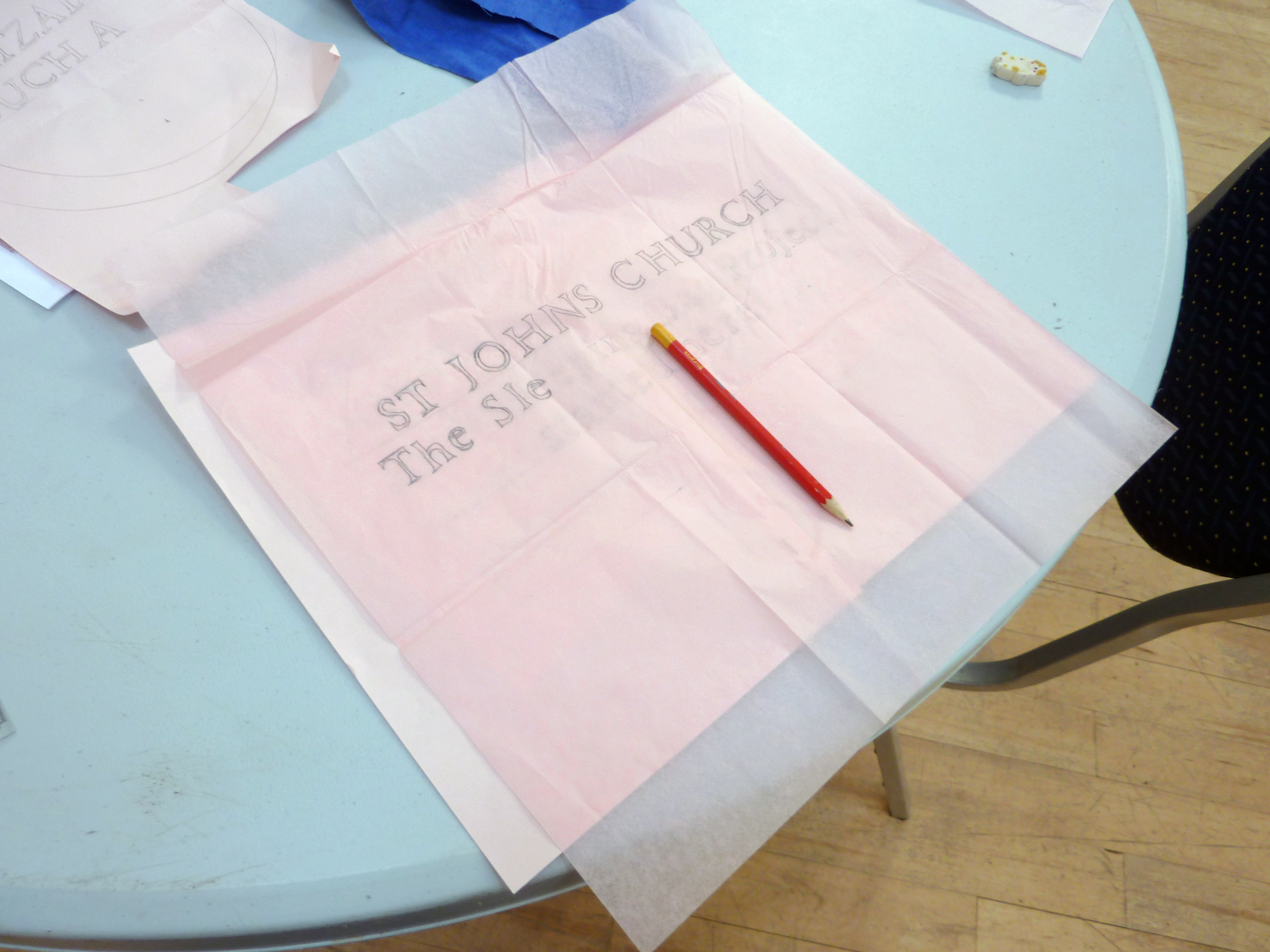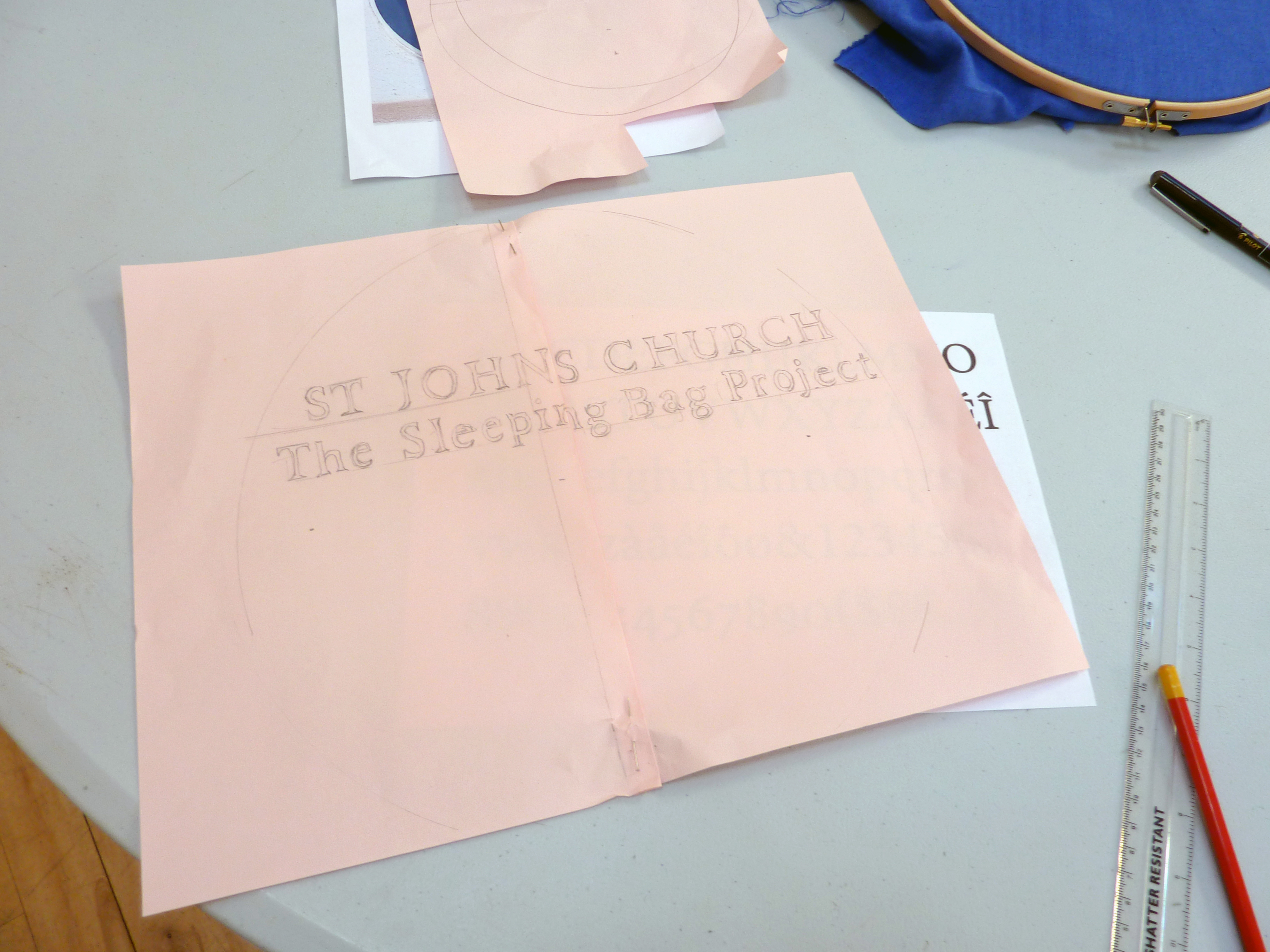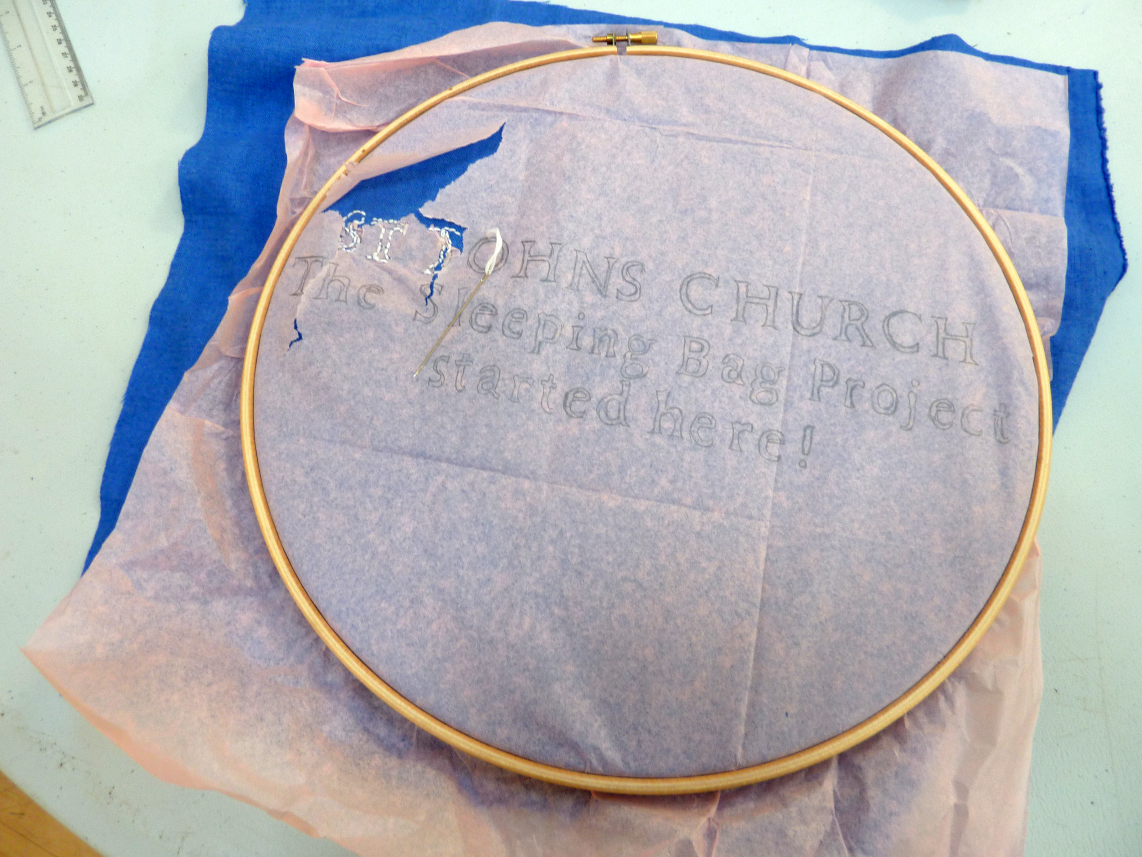 So, this week we (Leigh and I) are creating Blue Plaques of Intangible Experiences in the larger, open space at Great Horton Village Hall.. I am standing at the back beginning a new piece dedicated to St John’s Church, just a few meters away, where my real connection with Bradford began with ‘The Sleeping Bag Project’. The project was about reclaiming sleeping bags left at music festivals for people without homes who stay over night at the homeless shelter at St John’s Church. What the project became, although supposed to be a gift to others, was a process of reclaiming embroidery for me. It also fostered my relationship with June – which was very inspiring and exciting. I (re)discovered, through working with June, that embroidery could be both poetic and useful, and found a place at Bradford which was so accepting of this idea. I successfully overcame shyness in the creation of bold steps with art and stitch-based work that involved others. Blue Plaques of Intangible Experiences, I hope, is another stage in this inquiry.