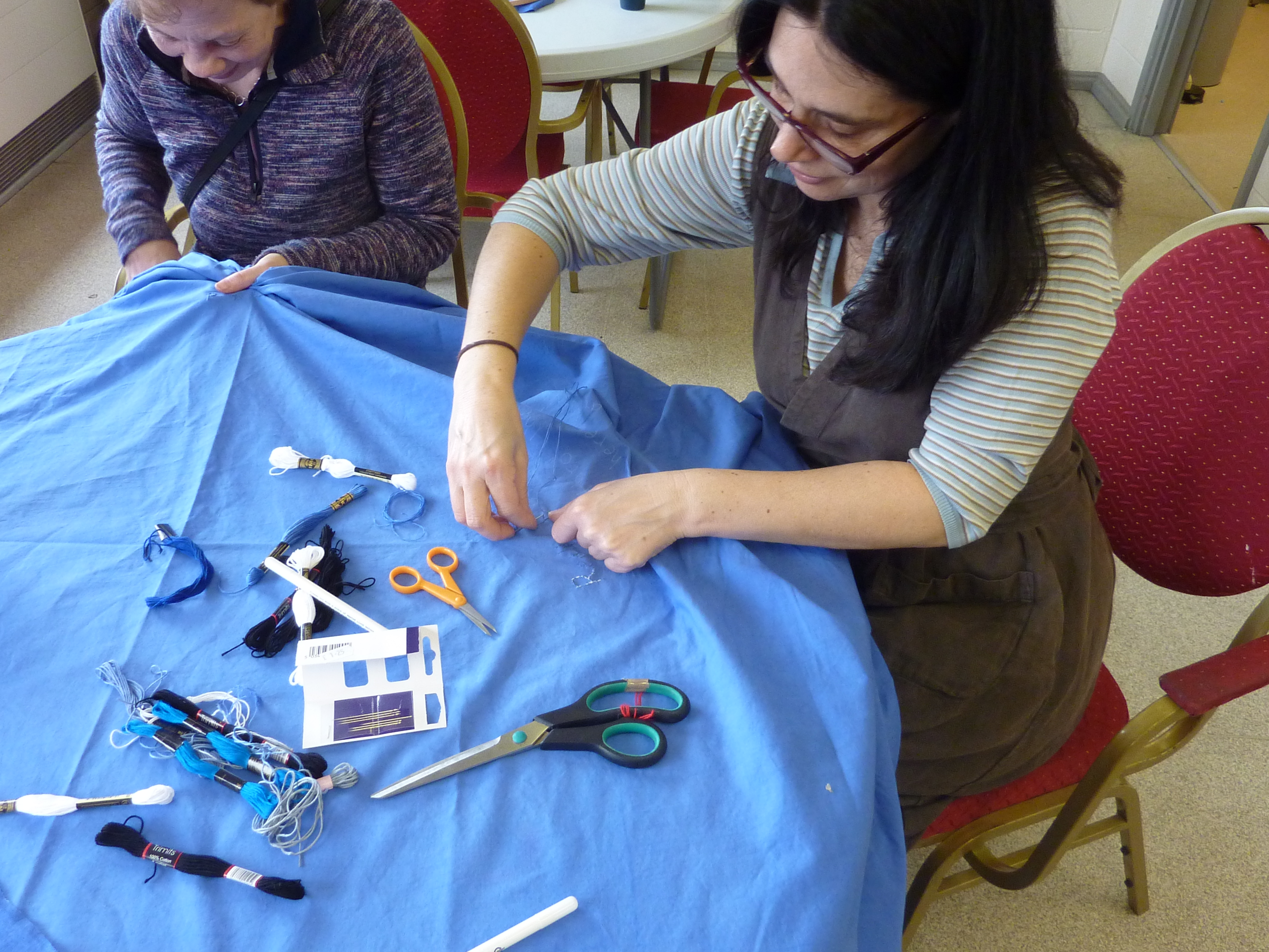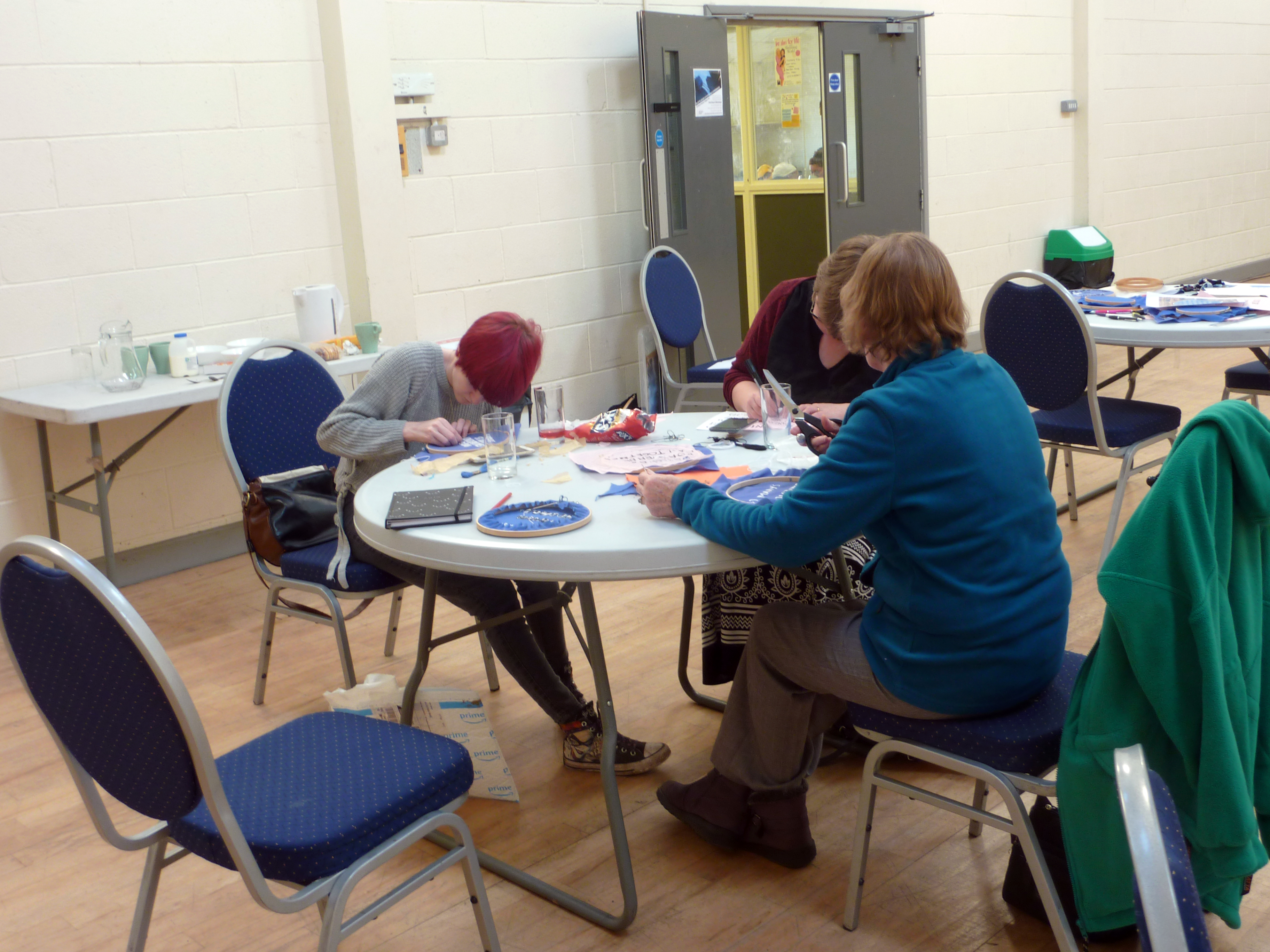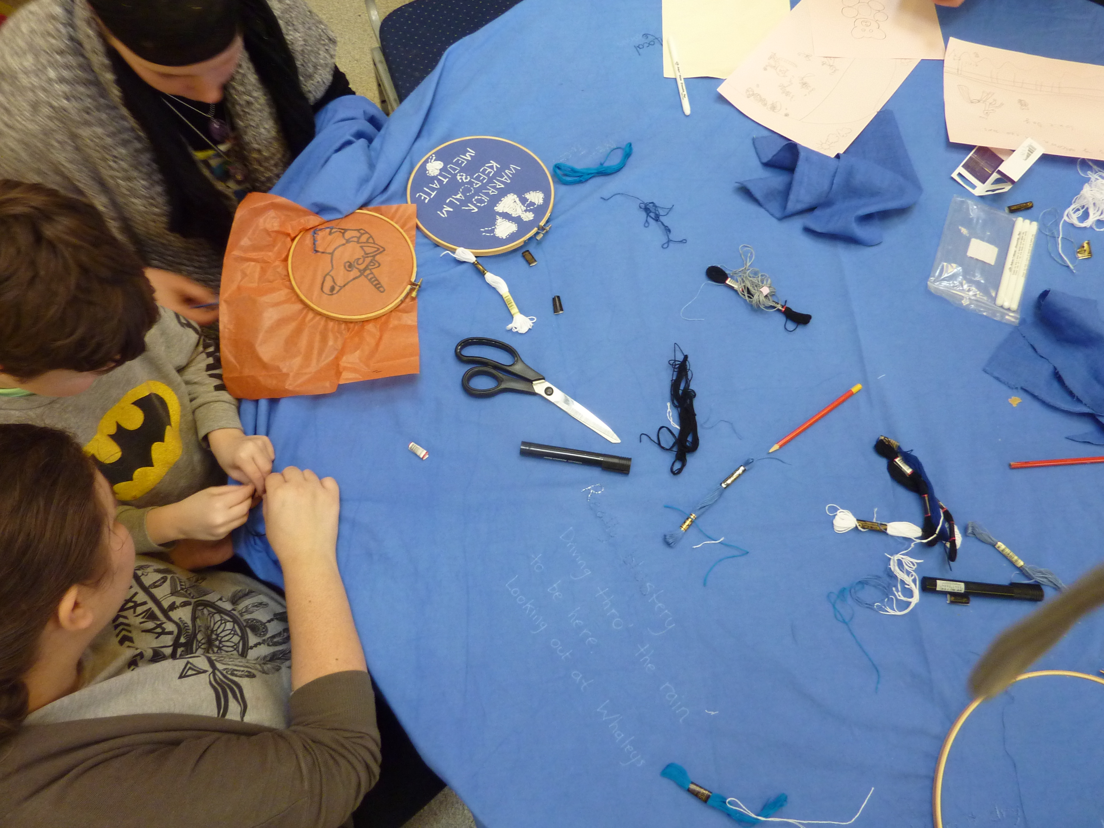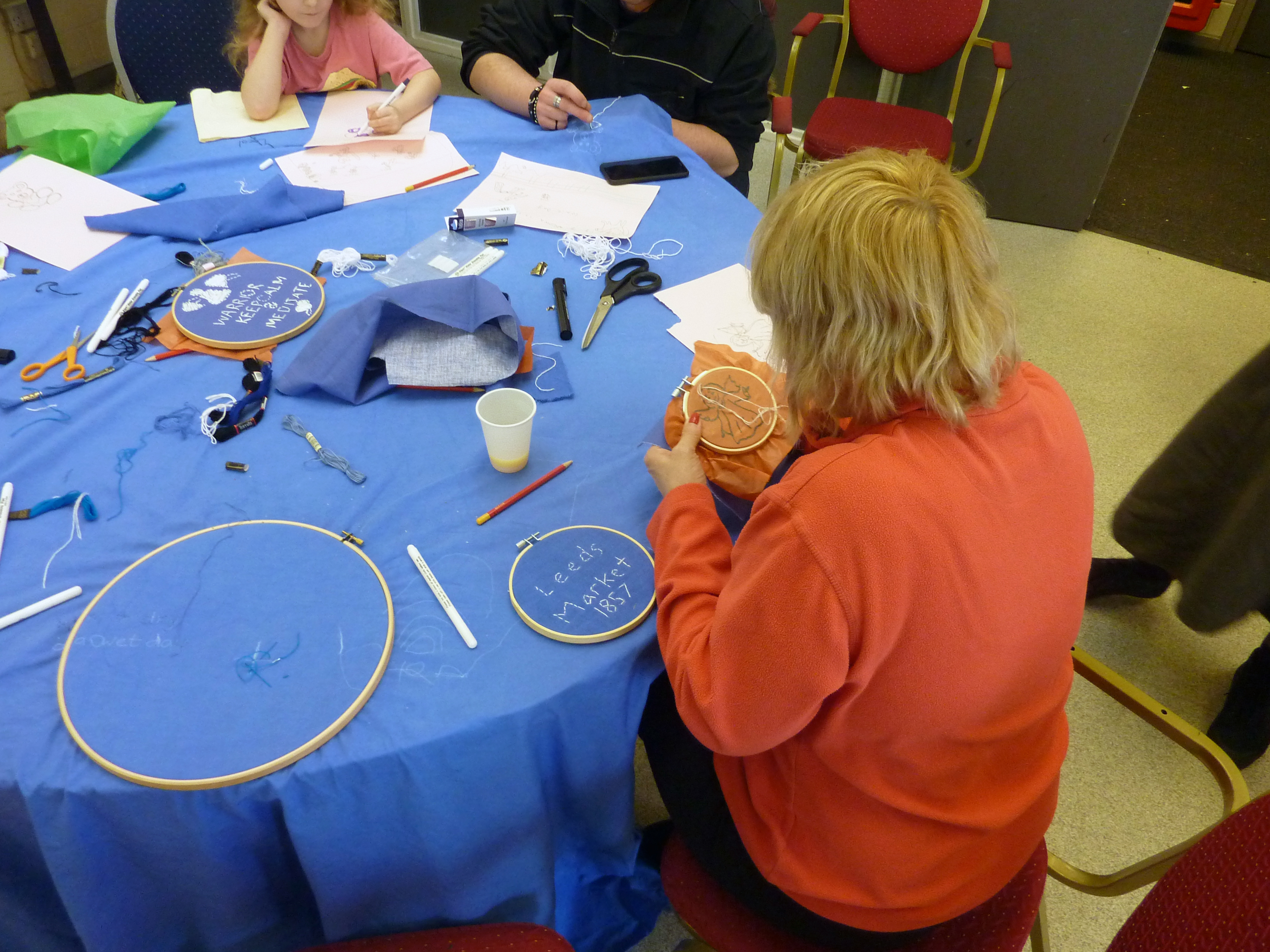 We had had a quiet start, but soon the room had become full and active with stitchery. We had a mix of people, all ages. I spoke over lunch with a local accountant. I counted two families, about four children, a refugee and her daughter, a lady on her own, our mother, granddaughter, grandmother trio, their friend, all collectively stitching away.. Some people knew about the event through word of mouth, others had seen our posters at Great Horton Community Hall. ‘When are you going to do this again’ ‘When is the next event’ ‘Can we take this on in our own community group’ were some comments we heard back from people there.