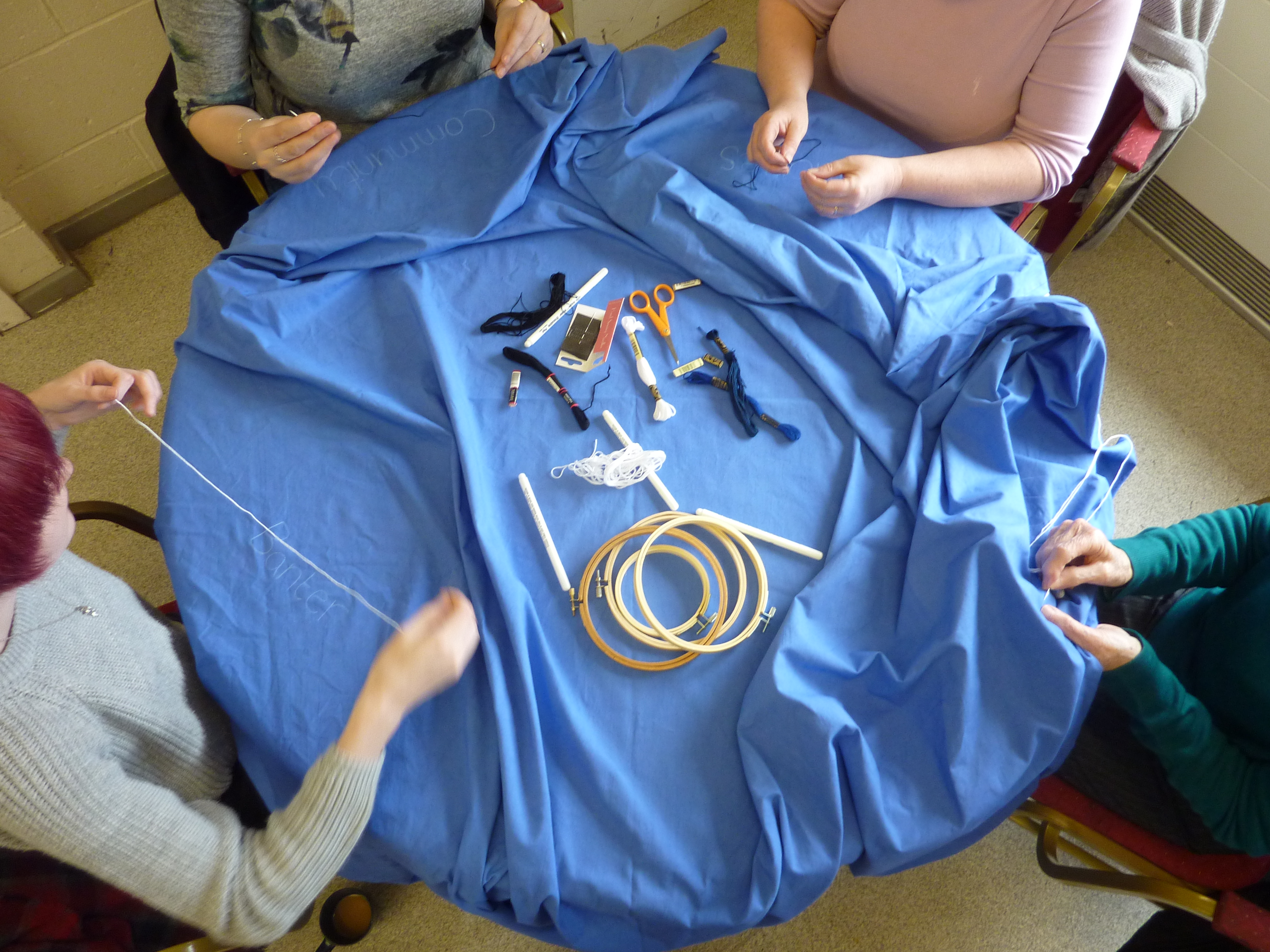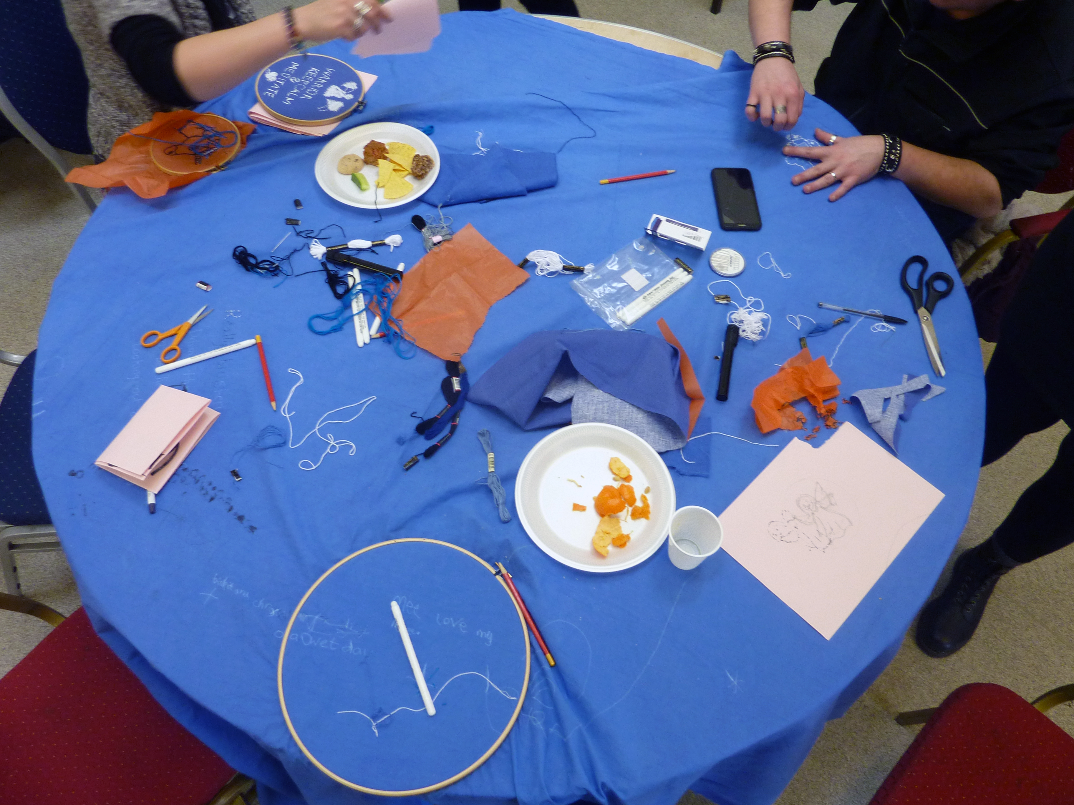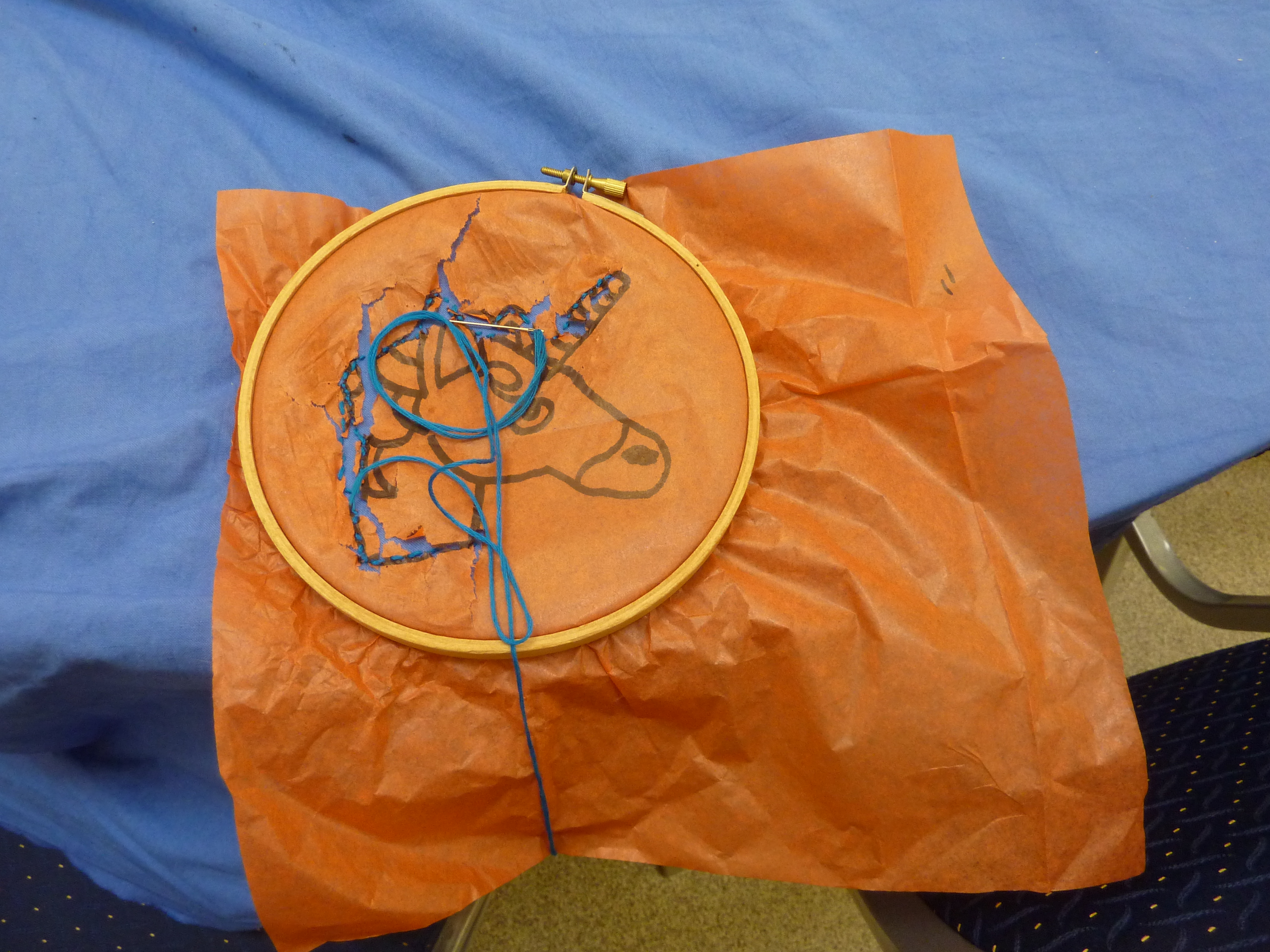 And then …more people arrive. We move our table cloth that June and I have been working on, over to a larger circular table, so we can all squeeze round. This then accommodates two families and a single women sewing an angel using a little embroidery hoop. A further layer of activity then begins to take place over the fabric. A young girl wants to sew a unicorn, her father thinks quickly and resourcefully and gets up an image onto his phone, that he can then trace onto tissue paper. Mum helps with some of the stitches.