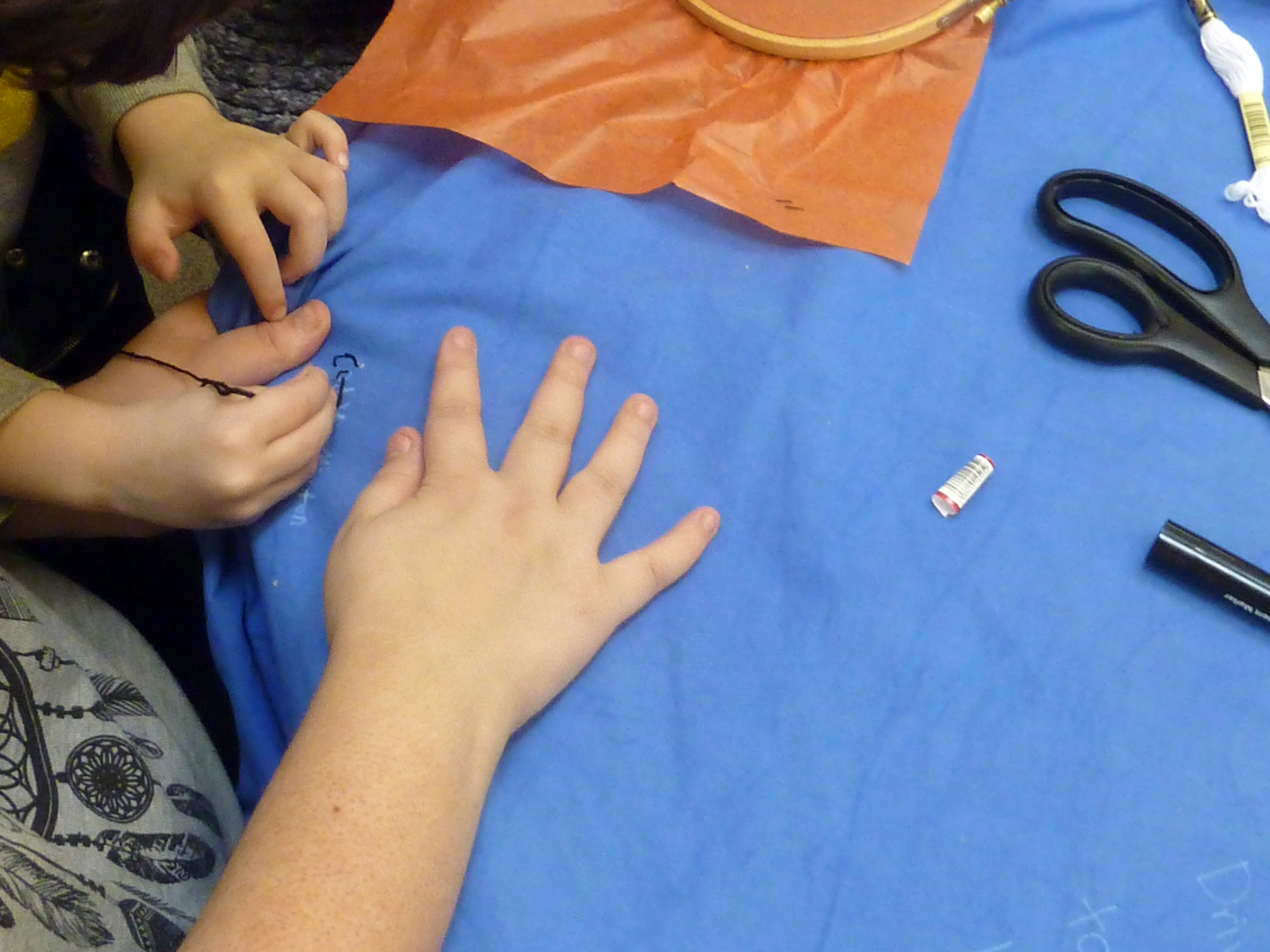 Sitting next to me a young boy is being taught to sew out the names in his family, slowly Tom Milton, Chloe Milton, Cody Milton and Eliza Milton take shape in black stranded thread.