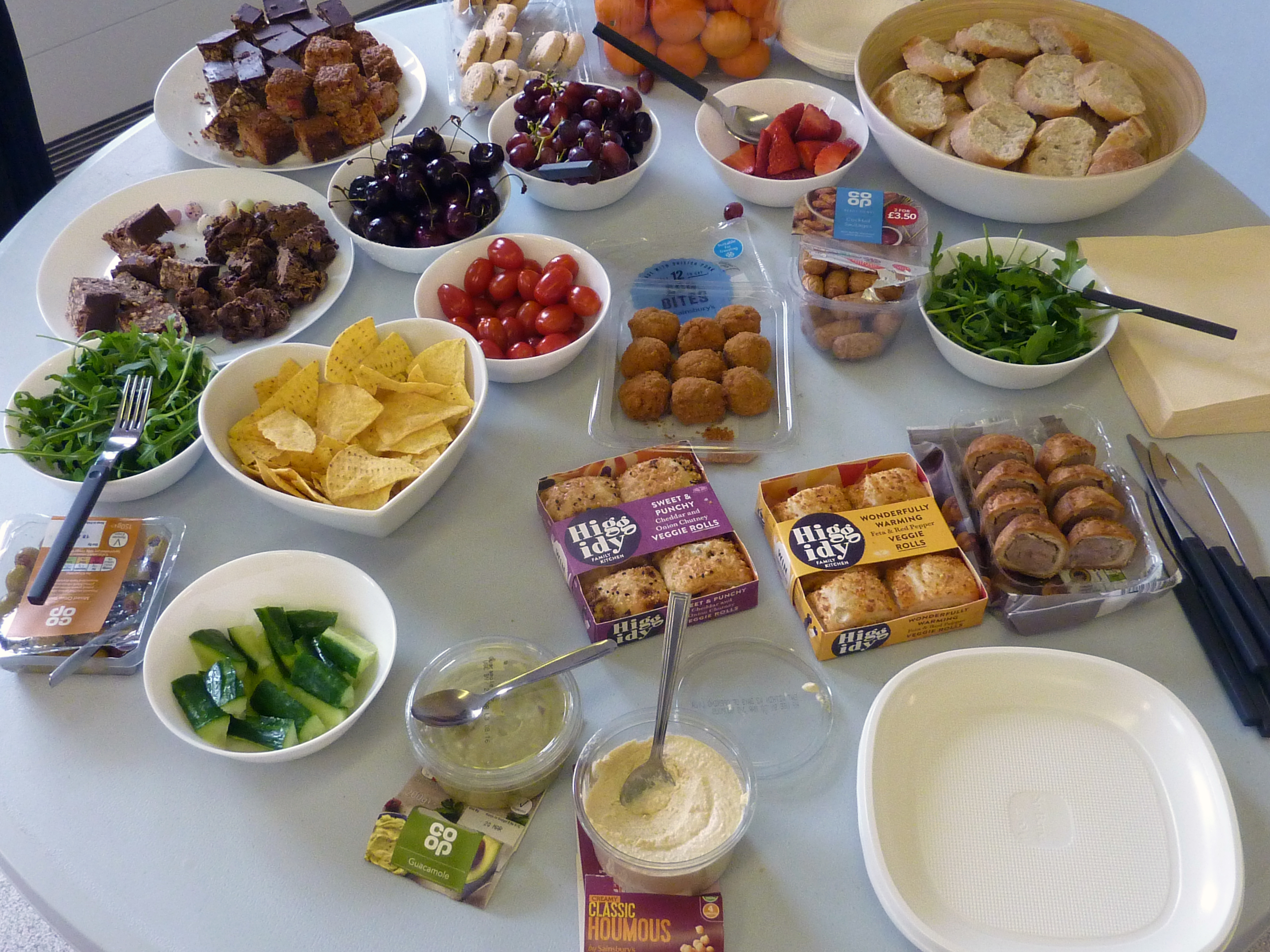 Meanwhile June has been preparing lunch. We advertised ‘small bites’ and cherries, grapes, baby tomatoes, halved pork pies, little sausages, hummus, crisps, slices of french bread, nicely cubed cakes fill our fourth round table. I think this may feel familiar to children, as, with the addition of paper plates, it is probably reminiscent of children’s party food. The food also gave our event a degree of informality.